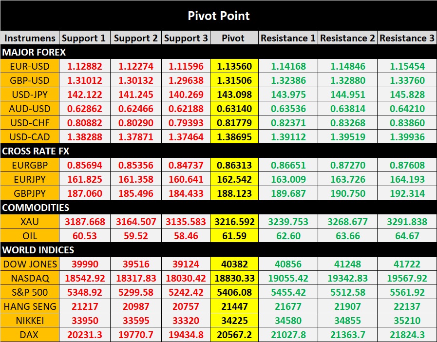 Berikut adalah rekomendasi harian untuk pasar forex, komoditas, dan indeks saham dunia berdasarkan analisis teknikal pada time frame H4. Data mencakup sinyal dari indikator RSI, MACD, serta pergerakan rata-rata (EMA), dan dilengkapi dengan level pivot untuk menentukan area entry, target profit (TP), dan stop loss (SL). Cocok untuk strategi jangka pendek harian.