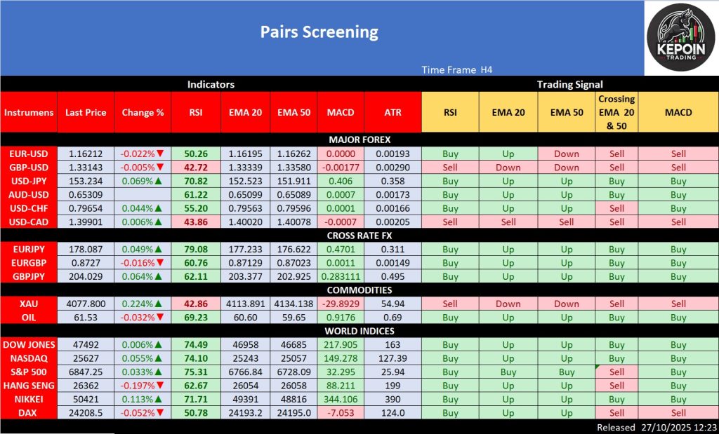 Analisa teknikal multi aset 27 Oktober 2025 memberikan gambaran menyeluruh terhadap kondisi pasar global dengan memanfaatkan kombinasi indikator utama seperti RSI, EMA (20 & 50), MACD, Pivot Point, dan ATR. Analisis dilakukan pada time frame H4 untuk memberikan pandangan jangka menengah terhadap berbagai kelas aset — mulai dari Forex Major, Cross Rate FX, Komoditas, hingga Indeks Dunia.