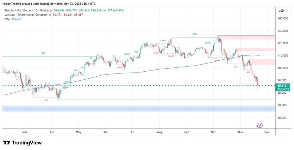 Area ini terlihat sebagai benteng terakhir sebelum Bitcoin masuk ke zona demand berikutnya di 70k–75k. Dari chart, bearish pressure masih cukup kuat, meski ada pantulan kecil di 85k.