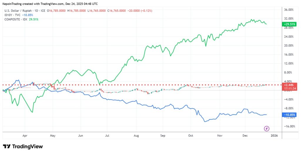 Imbal hasil obligasi yang menurun dapat berdampak pada pergerakan rupiah karena nilai tukar sering dipengaruhi oleh spread yield antara Indonesia dan yield global. Namun dalam 2025, tekanan yield yang lebih rendah tidak cukup untuk mendorong rupiah menguat signifikan. kontan.co.id