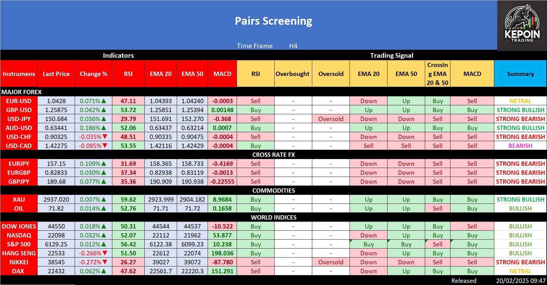 Analisa Teknikal Pasar (20 Februari 2025 – Time Frame H4) – Forex, Komoditas, Indeks