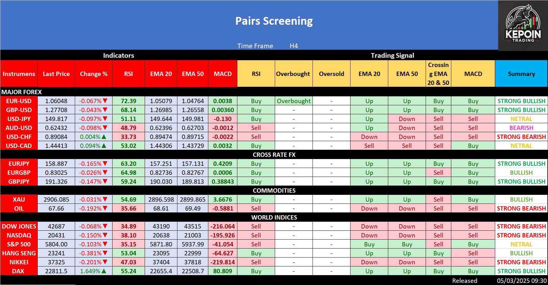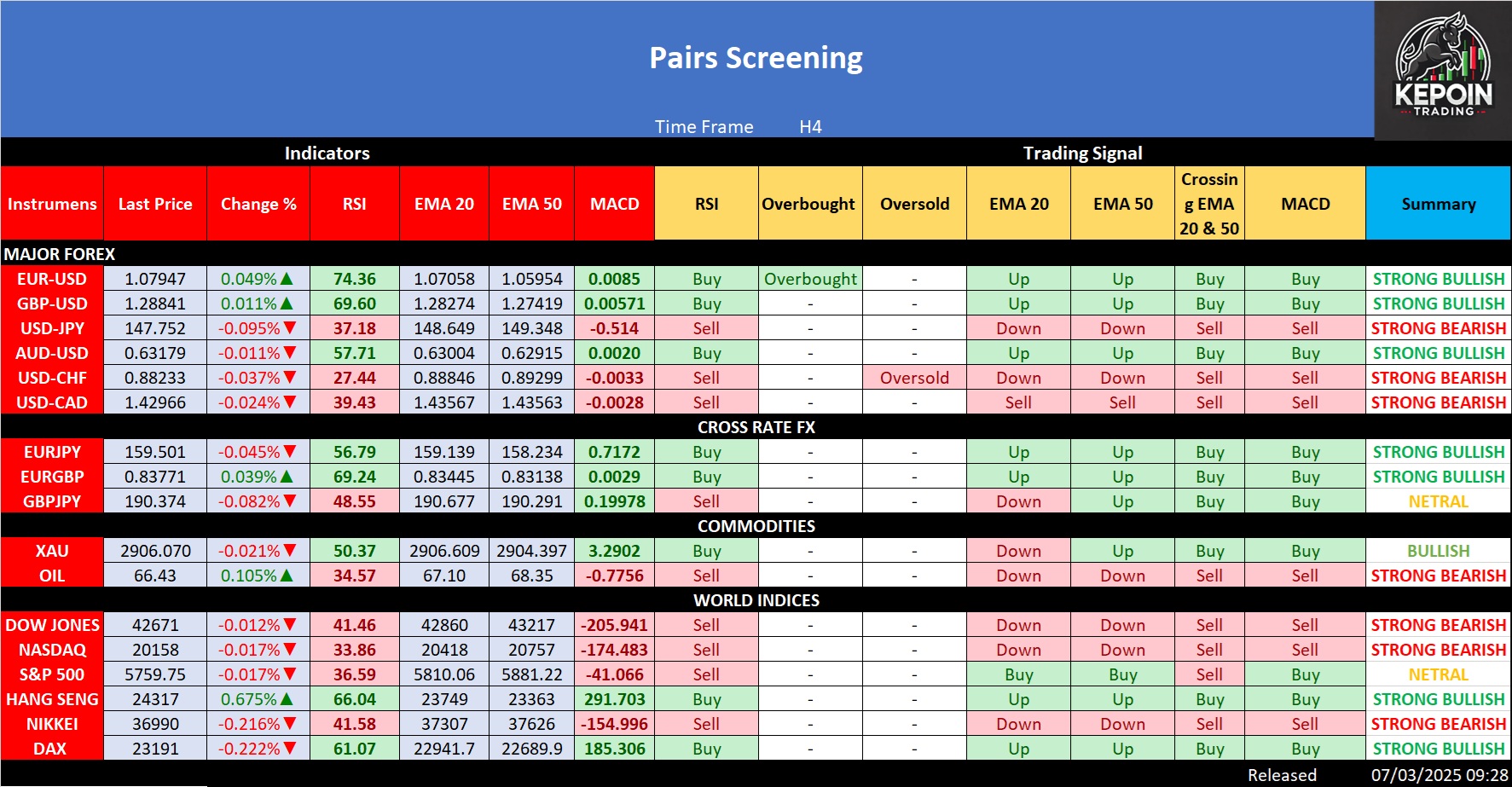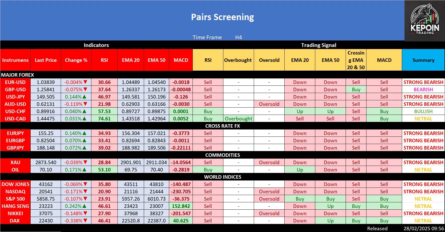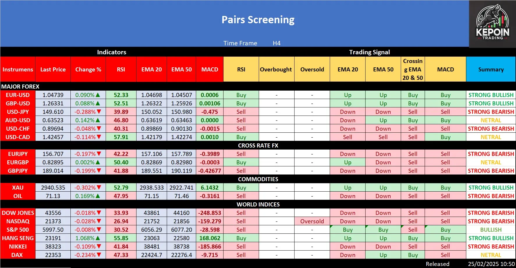 Tabel di atas memberikan sinyal trading dari beberapa instrumen (Forex, Cross Rate FX, Komoditas, dan Indeks Dunia) berdasarkan indikator teknikal seperti RSI, EMA (20 & […]