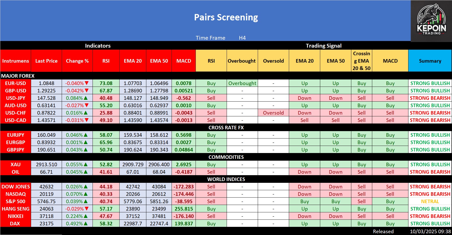 Laporan Analisis Teknikal Forex, Komoditas dan Indeks Saham – 10 Maret 2025 | Time Frame H4